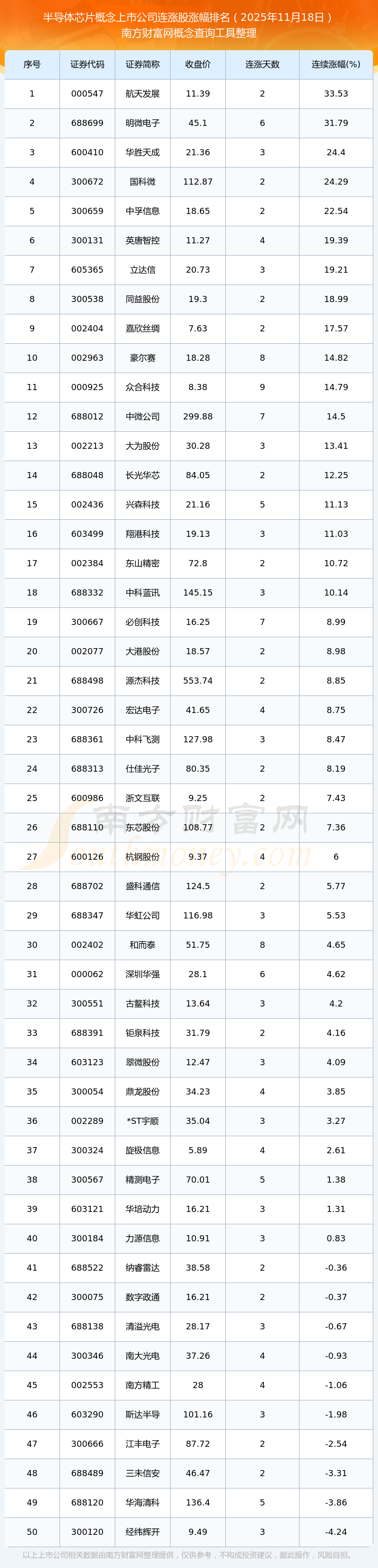 2025年11月18日半導(dǎo)體芯片概念上市公司連漲股漲幅排名