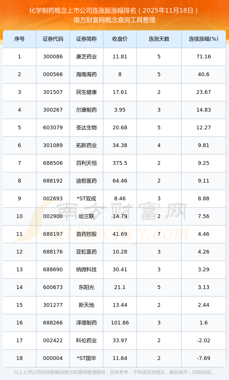 2025年11月18日化學(xué)制藥概念上市公司連漲股漲幅排名