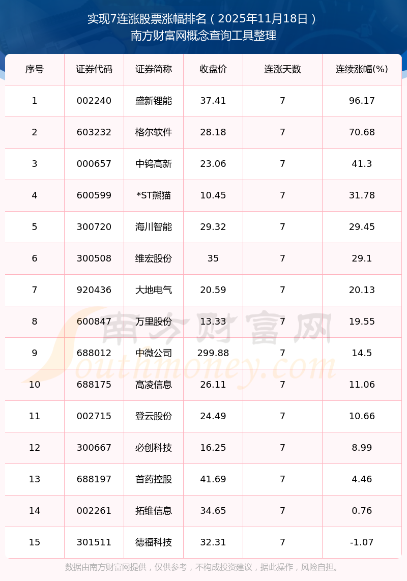 根據(jù)南方財富網(wǎng)概念查詢工具數(shù)據(jù)統(tǒng)計,截止2025年11月18日收盤,共有15只個股實(shí)現(xiàn)7天連漲。其中連續(xù)漲幅較大的個股有盛新鋰能、格爾軟件、中鎢高新等,連續(xù)漲幅分別為96.17%、70.68%、41.30%。