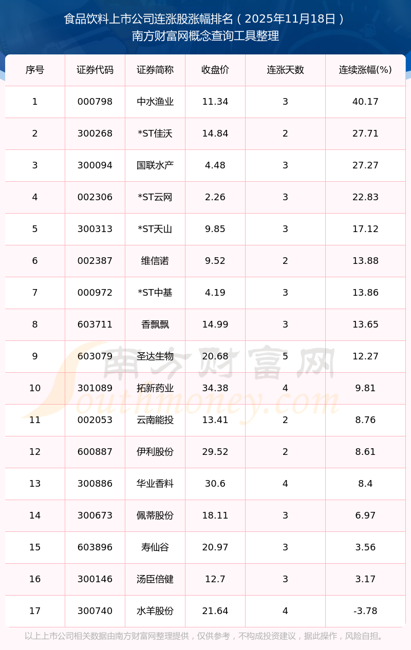 2025年11月18日食品飲料上市公司連漲股漲幅排名