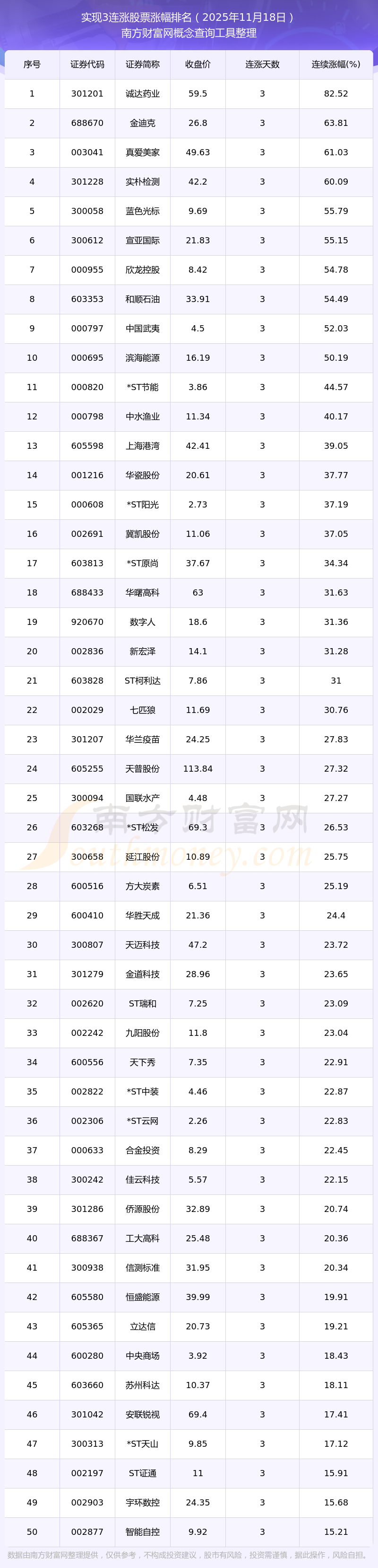 根據(jù)南方財(cái)富網(wǎng)概念查詢工具數(shù)據(jù)統(tǒng)計(jì),截止2025年11月18日收盤,共有174只個(gè)股實(shí)現(xiàn)3天連漲。其中連續(xù)漲幅較大的個(gè)股有誠(chéng)達(dá)藥業(yè)、金迪克、真愛(ài)美家等,連續(xù)漲幅分別為82.52%、63.81%、61.03%。