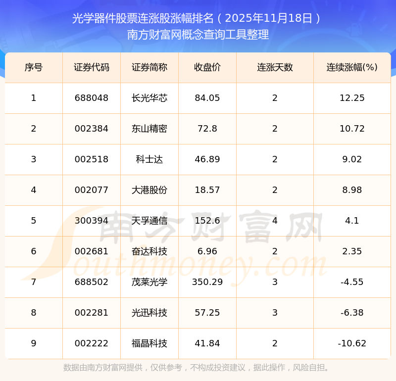 2025年11月18日光學(xué)器件股票連漲股漲幅排名