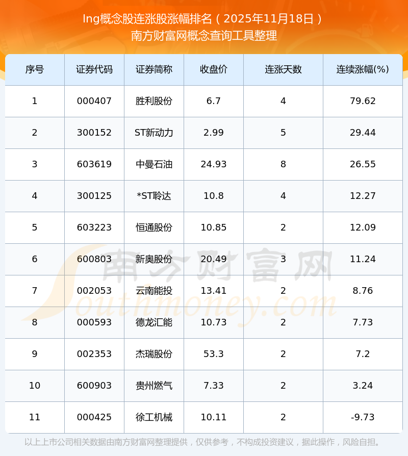 根據(jù)南方財(cái)富網(wǎng)概念查詢工具數(shù)據(jù)統(tǒng)計(jì),截止2025年11月18日收盤,lng概念股共有11只個(gè)股實(shí)現(xiàn)連漲。其中連續(xù)漲幅較大的個(gè)股有勝利股份、ST新動(dòng)力、中曼石油等,連續(xù)漲幅分別為79.62%、29.44%、26.55%。