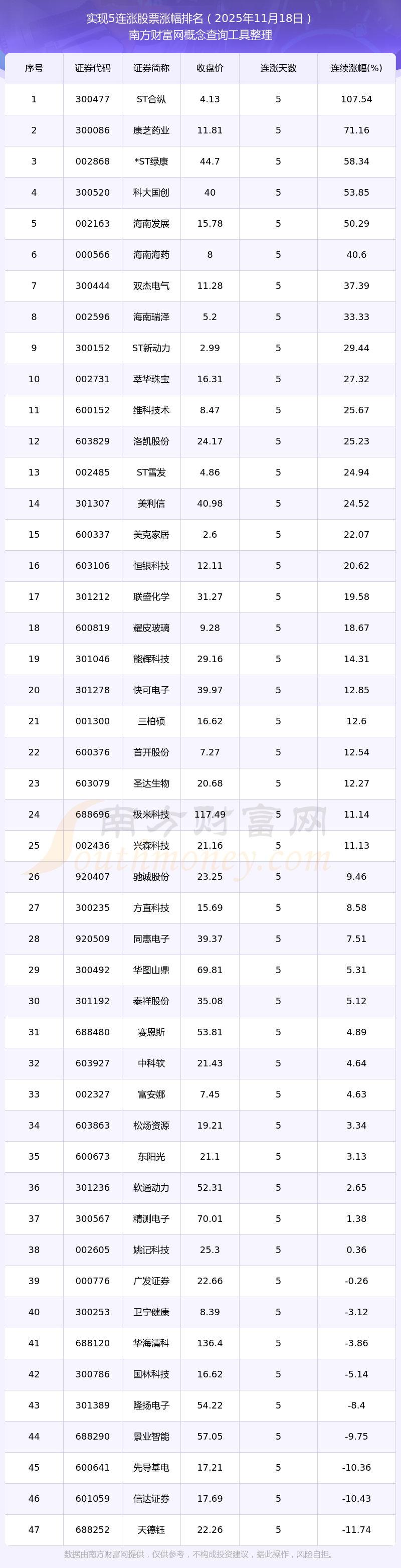 根據(jù)南方財富網(wǎng)概念查詢工具數(shù)據(jù)統(tǒng)計,截止2025年11月18日收盤,共有47只個股實現(xiàn)5天連漲。其中連續(xù)漲幅較大的個股有ST合縱、康芝藥業(yè)、*ST綠康等,連續(xù)漲幅分別為107.54%、71.16%、58.34%。