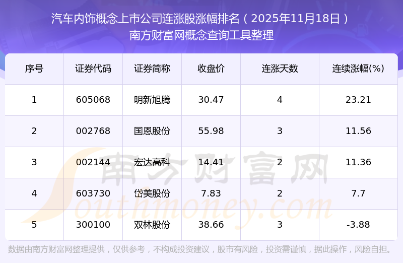 2025年11月18日汽車(chē)內(nèi)飾概念上市公司連漲股漲幅排名