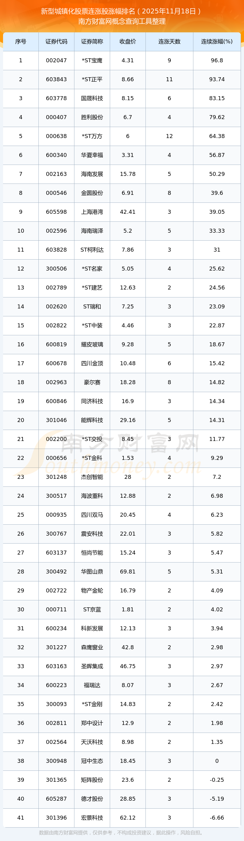 2025年11月18日新型城鎮(zhèn)化股票連漲股漲幅排名