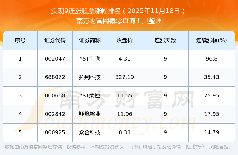 2025年11月18日實(shí)現(xiàn)9連漲股票漲幅排名