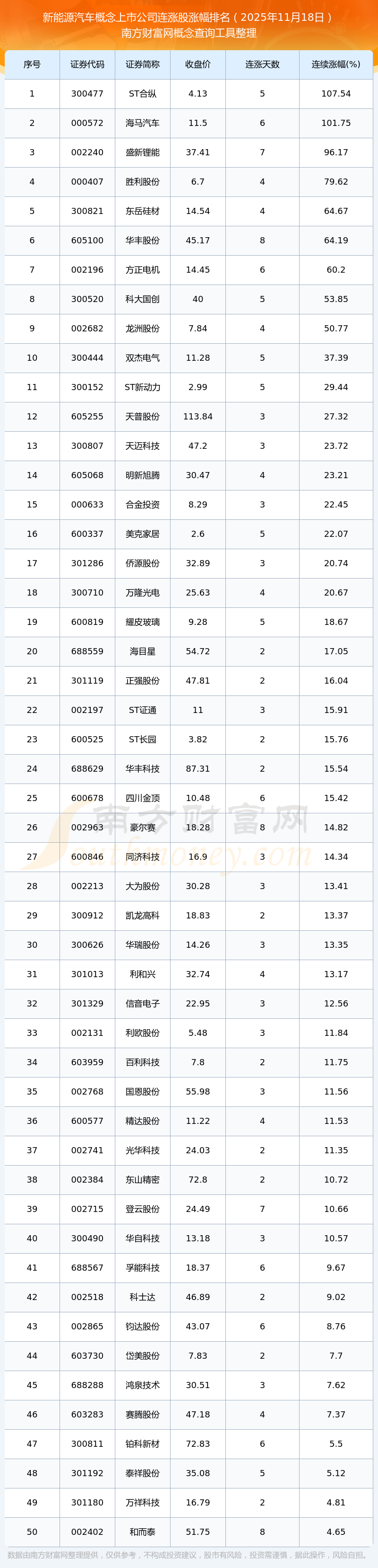 根據(jù)南方財富網(wǎng)概念查詢工具數(shù)據(jù)統(tǒng)計,截止2025年11月18日收盤,新能源汽車概念上市公司共有89只個股實現(xiàn)連漲。其中連續(xù)漲幅較大的個股有ST合縱、海馬汽車、盛新鋰能等,連續(xù)漲幅分別為107.54%、101.75%、96.17%。