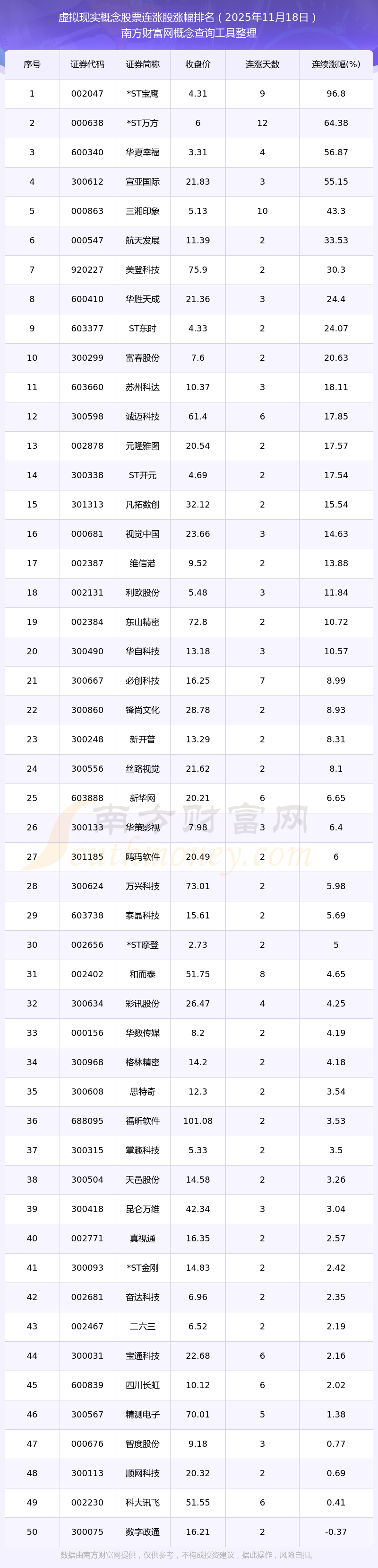 2025年11月18日虛擬現(xiàn)實概念股票連漲股漲幅排名