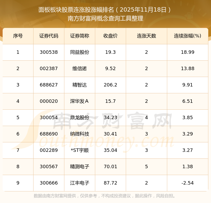 2025年11月18日面板板塊股票連漲股漲幅排名