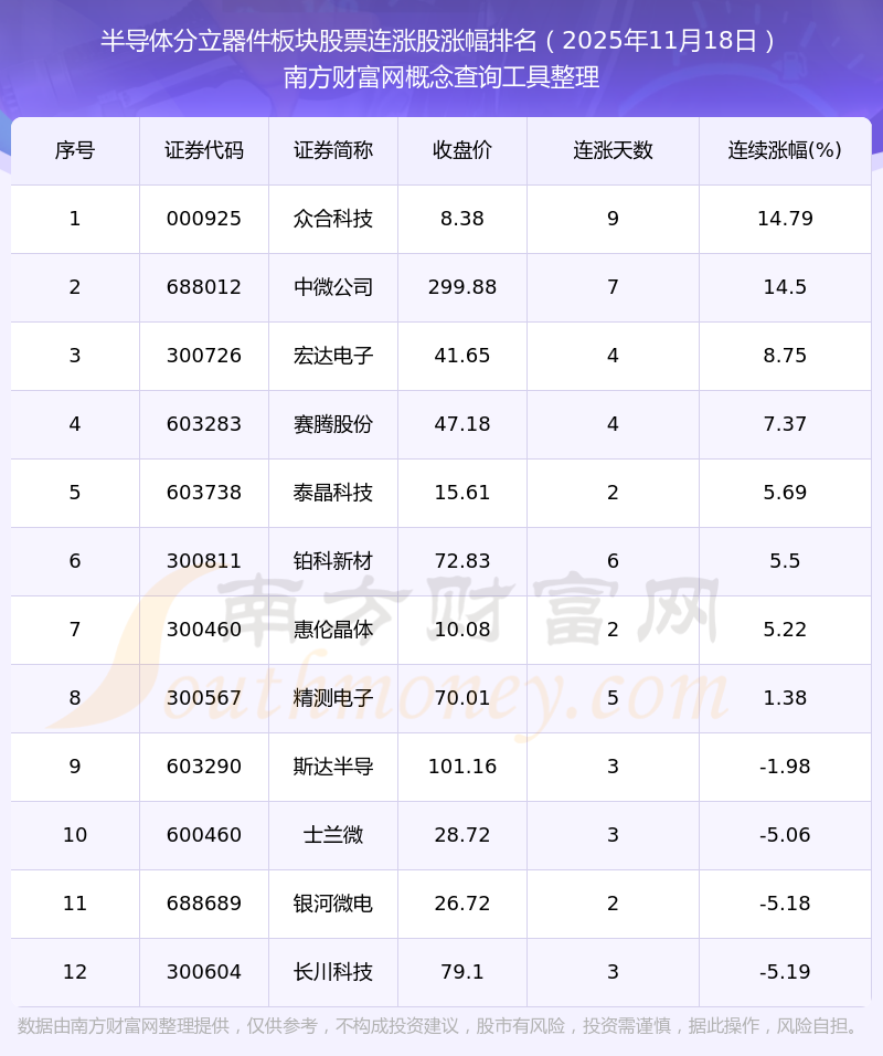 2025年11月18日半導(dǎo)體分立器件板塊股票連漲股漲幅排名