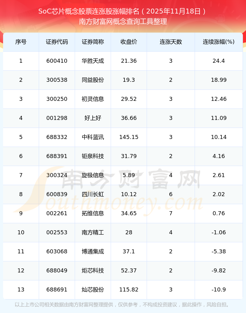 根據(jù)南方財富網(wǎng)概念查詢工具數(shù)據(jù)統(tǒng)計,截止2025年11月18日收盤,SoC芯片概念股票共有13只個股實現(xiàn)連漲。其中連續(xù)漲幅較大的個股有華勝天成、同益股份、初靈信息等,連續(xù)漲幅分別為24.40%、18.99%、12.46%。