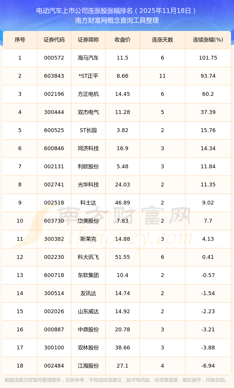 根據(jù)南方財富網(wǎng)概念查詢工具數(shù)據(jù)統(tǒng)計,截止2025年11月18日收盤,電動汽車上市公司共有18只個股實現(xiàn)連漲。其中連續(xù)漲幅較大的個股有海馬汽車、*ST正平、方正電機等,連續(xù)漲幅分別為101.75%、93.74%、60.20%。