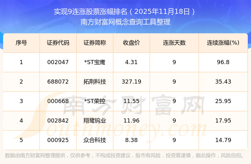 根據南方財富網概念查詢工具數據統(tǒng)計,截止2025年11月18日收盤,共有5只個股實現9天連漲。其中連續(xù)漲幅較大的個股有*ST寶鷹、拓荊科技、*ST榮控等,連續(xù)漲幅分別為96.80%、35.43%、25.95%。