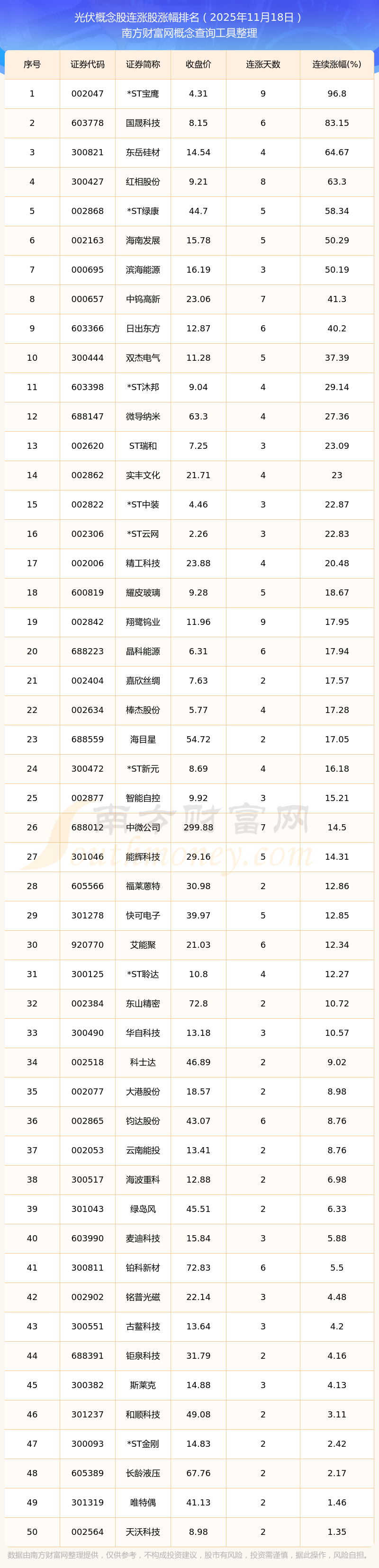 根據(jù)南方財富網(wǎng)概念查詢工具數(shù)據(jù)統(tǒng)計,截止2025年11月18日收盤,光伏概念股共有57只個股實現(xiàn)連漲。其中連續(xù)漲幅較大的個股有*ST寶鷹、國晟科技、東岳硅材等,連續(xù)漲幅分別為96.80%、83.15%、64.67%。