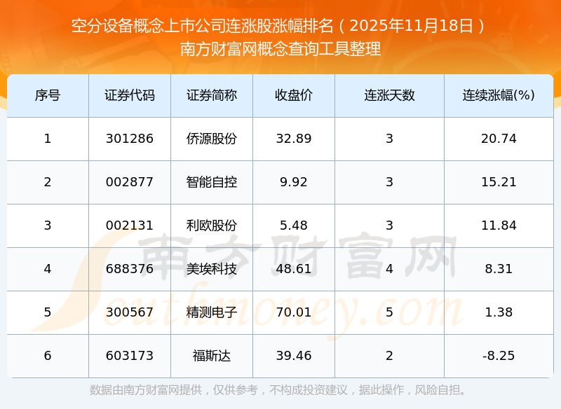 2025年11月18日空分設(shè)備概念上市公司連漲股漲幅排名