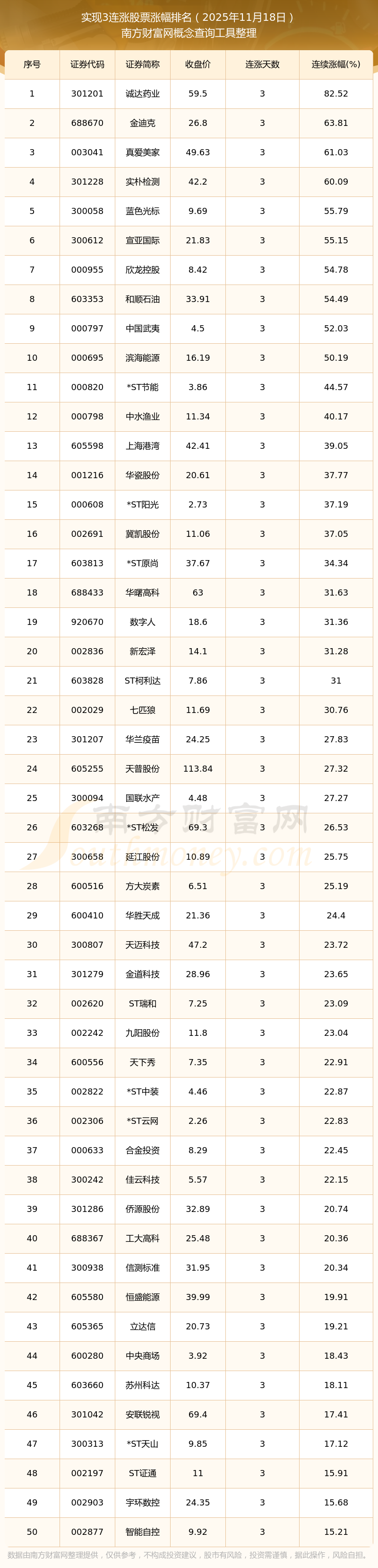 2025年11月18日實(shí)現(xiàn)3連漲股票漲幅排名