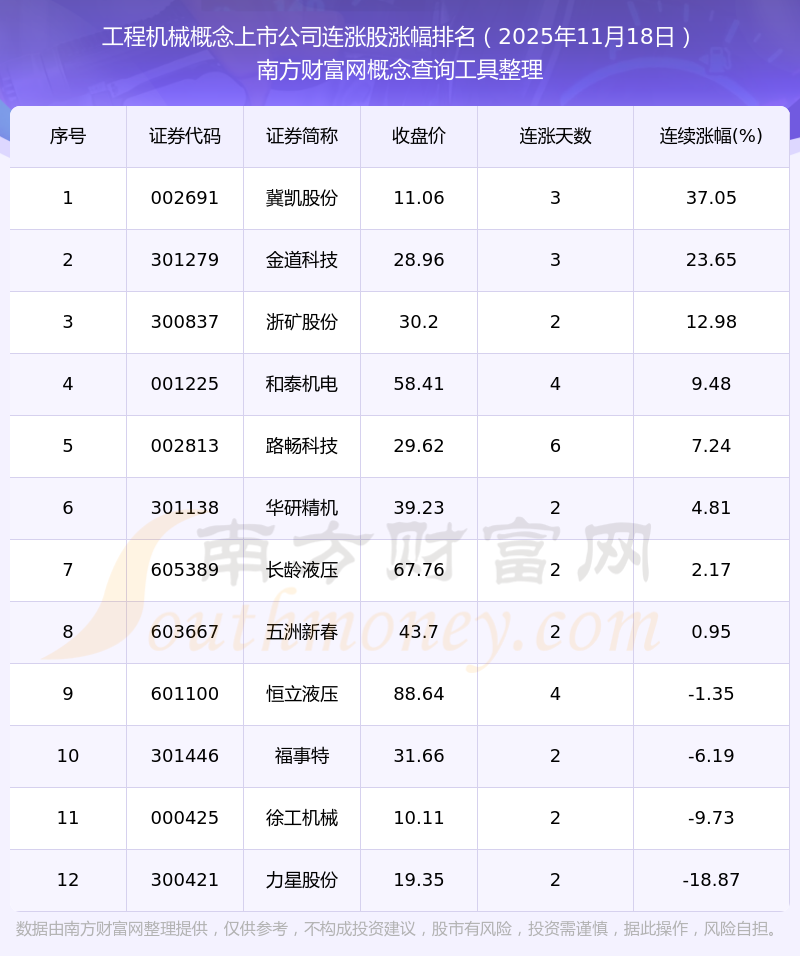 2025年11月18日工程機(jī)械概念上市公司連漲股漲幅排名