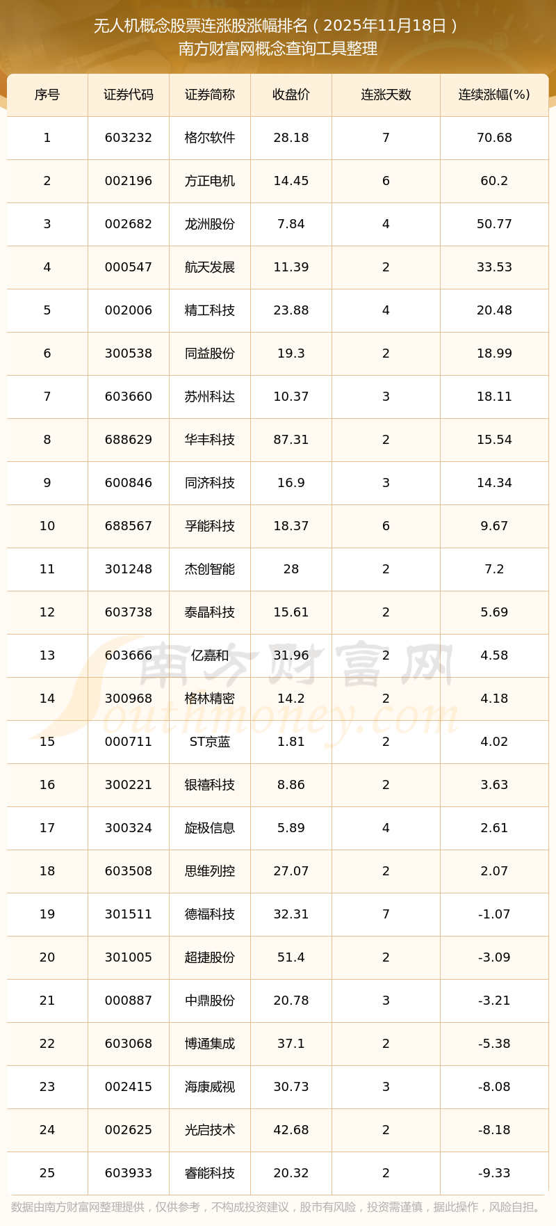 2025年11月18日無人機概念股票連漲股漲幅排名