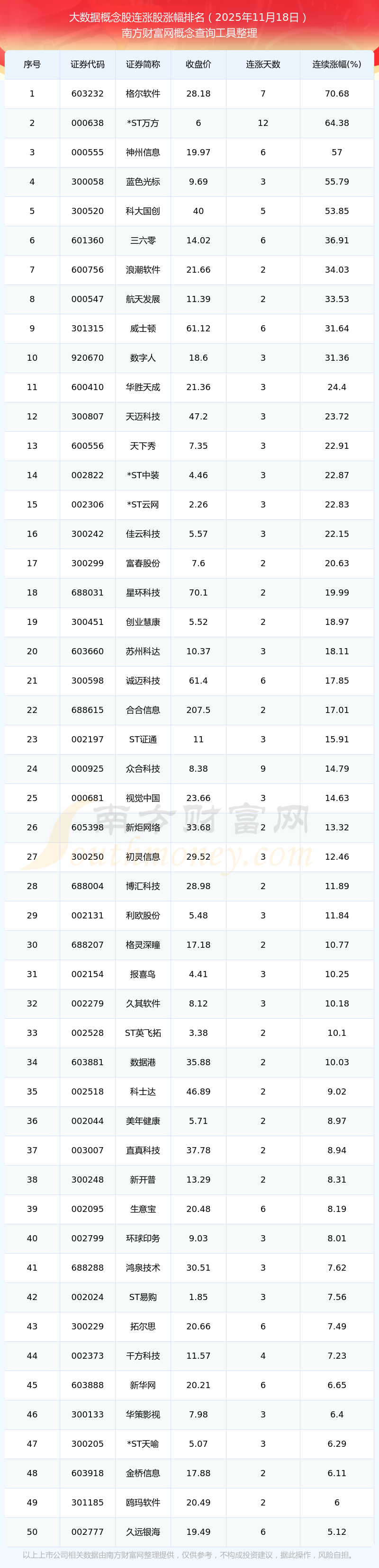 2025年11月18日大數(shù)據(jù)概念股連漲股漲幅排名