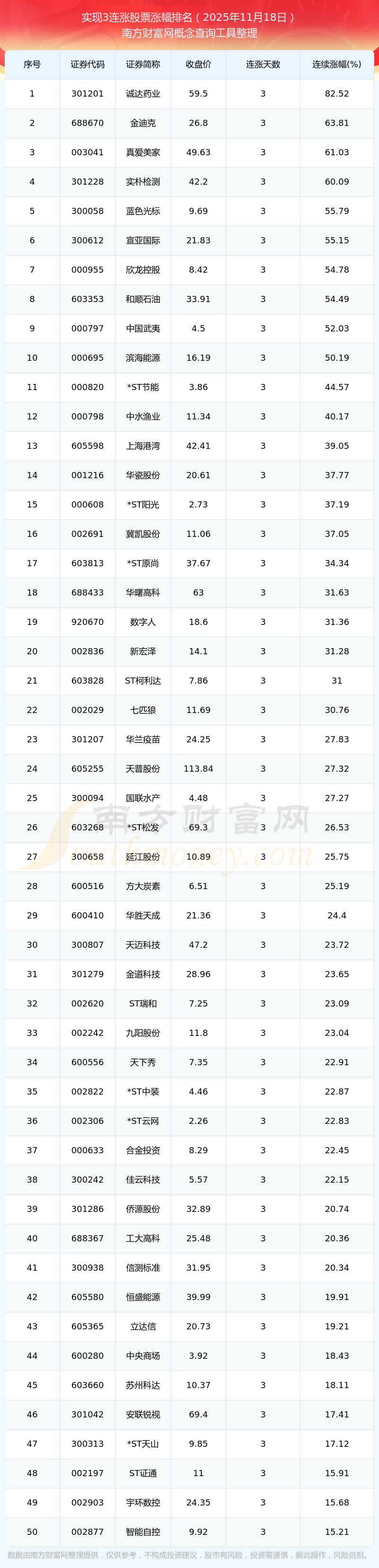 2025年11月18日實現(xiàn)3連漲股票漲幅排名