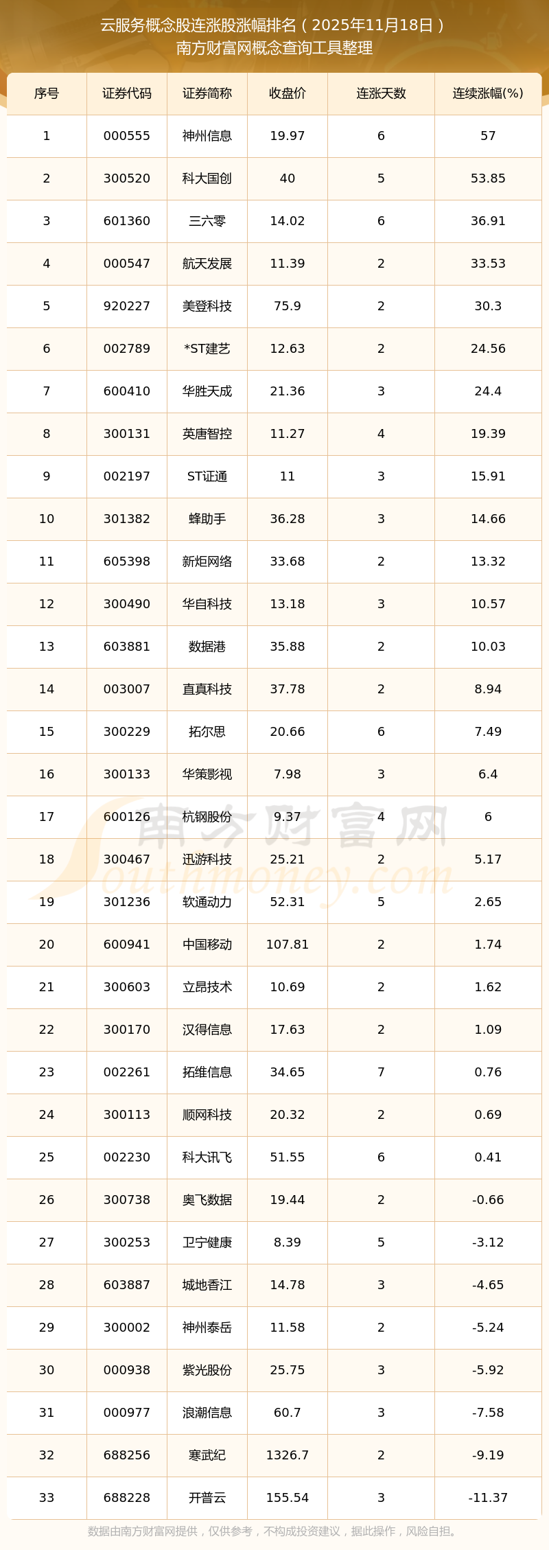 2025年11月18日云服務(wù)概念股連漲股漲幅排名
