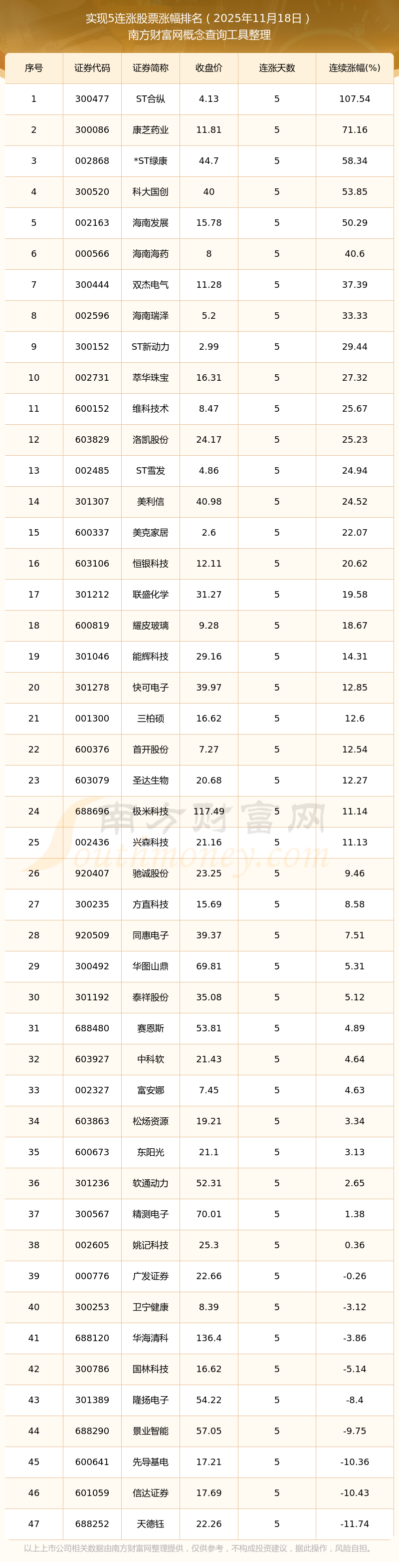 2025年11月18日實(shí)現(xiàn)5連漲股票漲幅排名