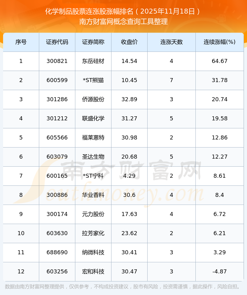 2025年11月18日化學(xué)制品股票連漲股漲幅排名