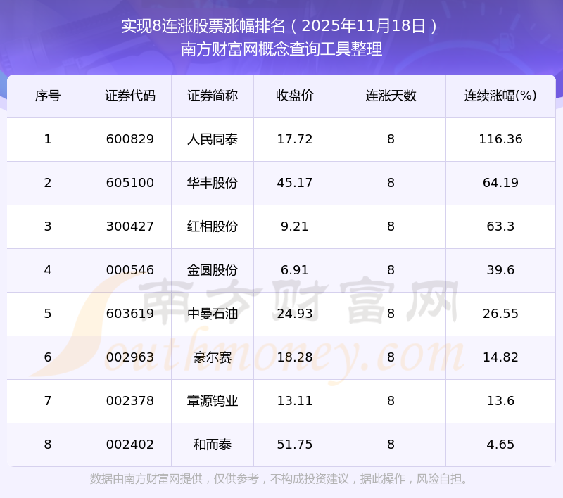 根據(jù)南方財富網(wǎng)概念查詢工具數(shù)據(jù)統(tǒng)計,截止2025年11月18日收盤,共有8只個股實現(xiàn)8天連漲。其中連續(xù)漲幅較大的個股有人民同泰、華豐股份、紅相股份等,連續(xù)漲幅分別為116.36%、64.19%、63.30%。