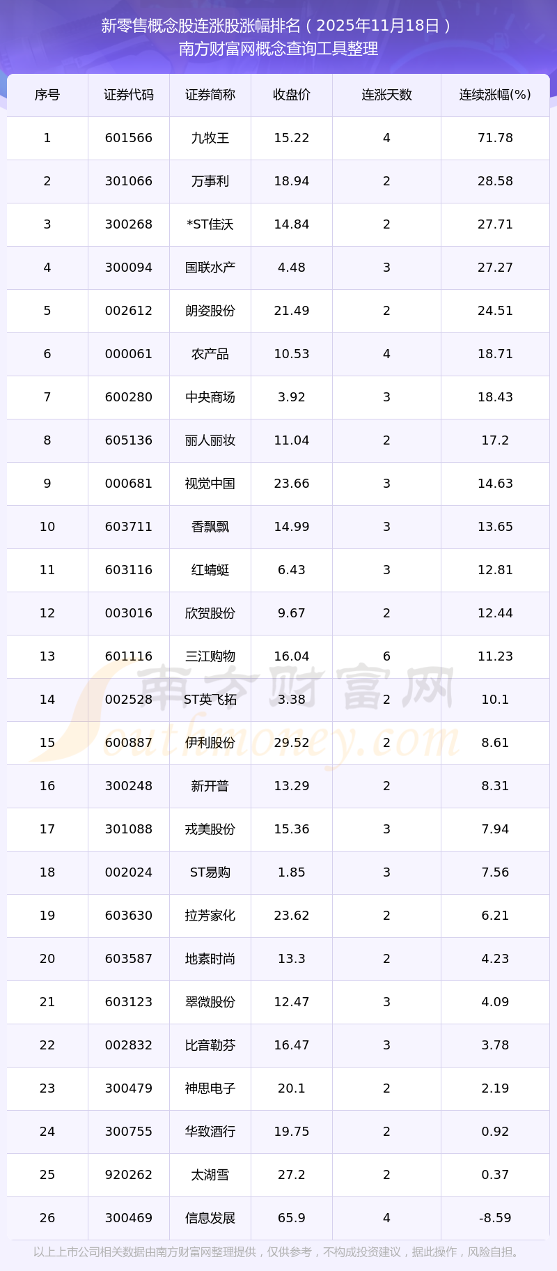 2025年11月18日新零售概念股連漲股票漲幅排名