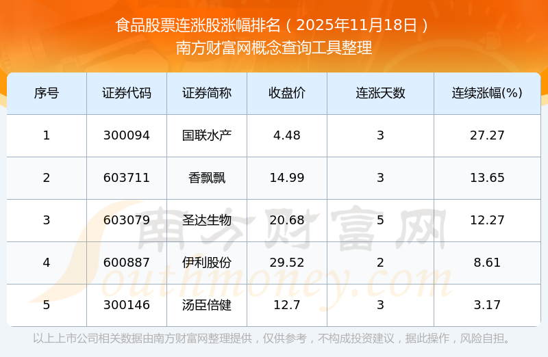 根據(jù)南方財富網概念查詢工具數(shù)據(jù)統(tǒng)計,截止2025年11月18日收盤,食品股票共有5只個股實現(xiàn)連漲。其中連續(xù)漲幅較大的個股有國聯(lián)水產、香飄飄、圣達生物等,連續(xù)漲幅分別為27.27%、13.65%、12.27%。