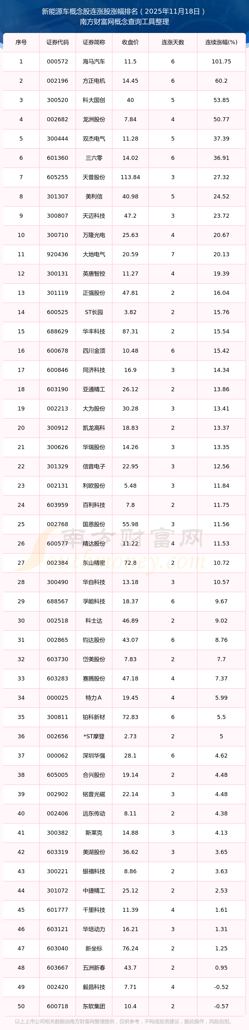 根據(jù)南方財(cái)富網(wǎng)概念查詢工具數(shù)據(jù)統(tǒng)計(jì),截止2025年11月18日收盤(pán),新能源車概念股共有67只個(gè)股實(shí)現(xiàn)連漲。其中連續(xù)漲幅較大的個(gè)股有海馬汽車、方正電機(jī)、科大國(guó)創(chuàng)等,連續(xù)漲幅分別為101.75%、60.20%、53.85%。