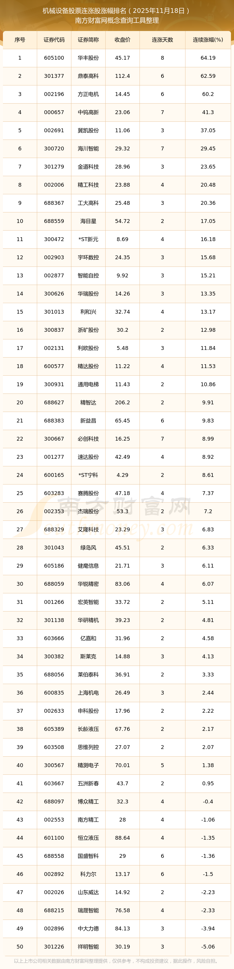 2025年11月18日機械設(shè)備股票連漲股漲幅排名