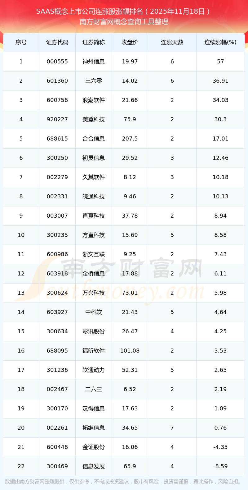 2025年11月18日SAAS概念上市公司連漲股漲幅排名