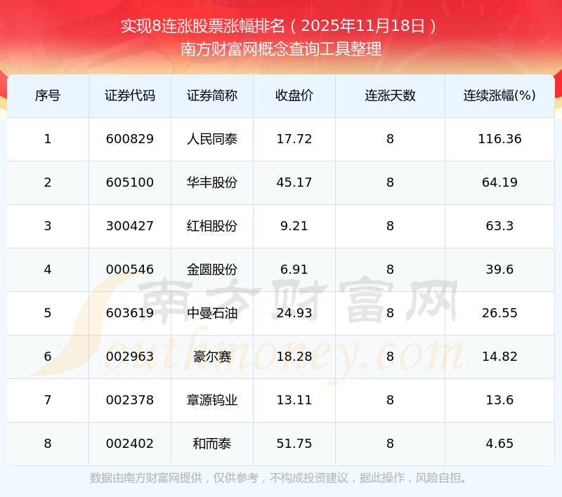 根據南方財富網概念查詢工具數(shù)據統(tǒng)計,截止2025年11月18日收盤,共有8只個股實現(xiàn)8天連漲。其中連續(xù)漲幅較大的個股有人民同泰、華豐股份、紅相股份等,連續(xù)漲幅分別為116.36%、64.19%、63.30%。