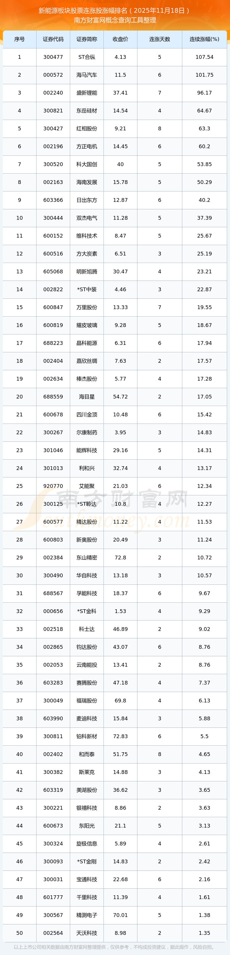 根據南方財富網概念查詢工具數據統(tǒng)計,截止2025年11月18日收盤,新能源板塊股票共有70只個股實現連漲。其中連續(xù)漲幅較大的個股有ST合縱、海馬汽車、盛新鋰能等,連續(xù)漲幅分別為107.54%、101.75%、96.17%。