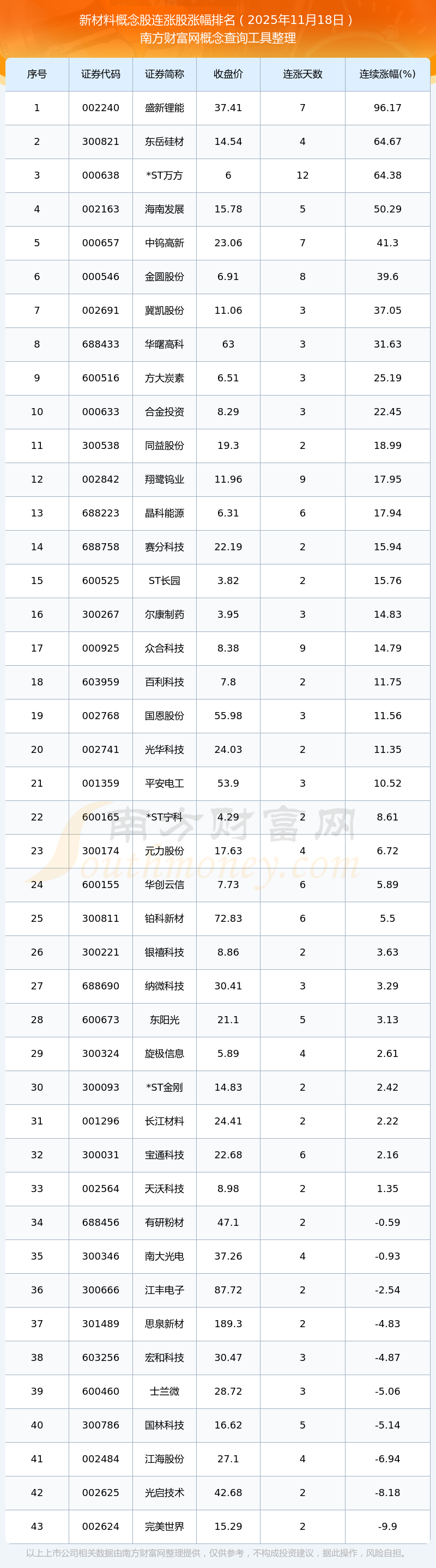 根據(jù)南方財富網(wǎng)概念查詢工具數(shù)據(jù)統(tǒng)計,截止2025年11月18日收盤,新材料概念股共有43只個股實現(xiàn)連漲。其中連續(xù)漲幅較大的個股有盛新鋰能、東岳硅材、*ST萬方等,連續(xù)漲幅分別為96.17%、64.67%、64.38%。