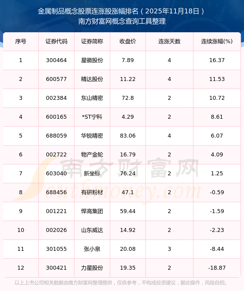 2025年11月18日金屬制品概念股票連漲股漲幅排名