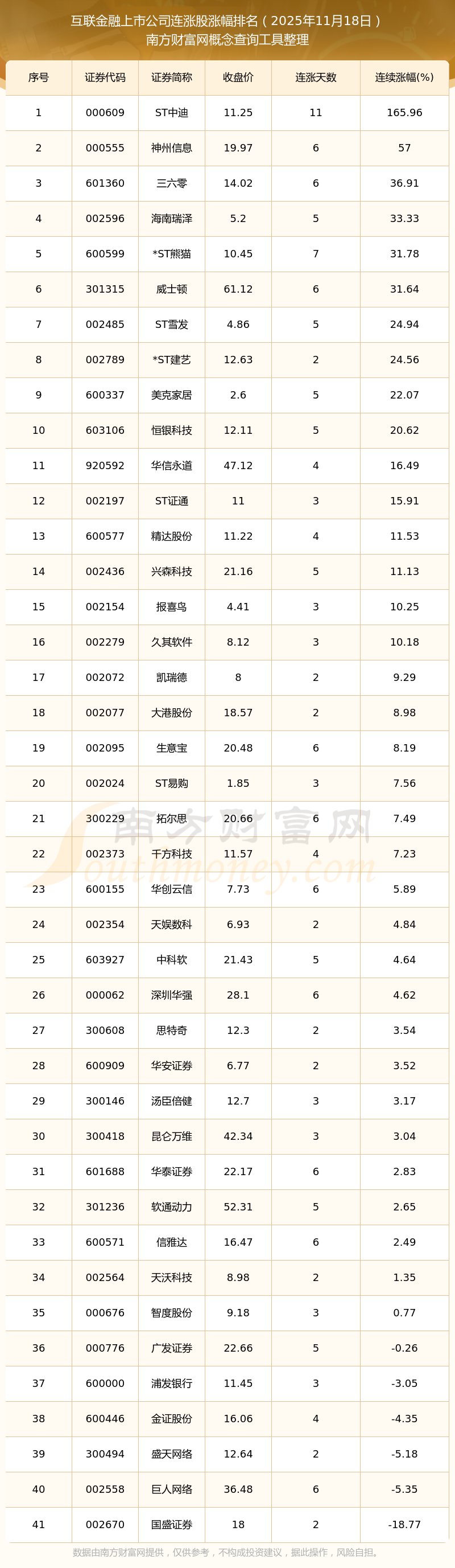 2025年11月18日互聯(lián)金融上市公司連漲股漲幅排名