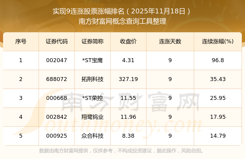根據(jù)南方財富網(wǎng)概念查詢工具數(shù)據(jù)統(tǒng)計,截止2025年11月18日收盤,共有5只個股實現(xiàn)9天連漲。其中連續(xù)漲幅較大的個股有*ST寶鷹、拓荊科技、*ST榮控等,連續(xù)漲幅分別為96.80%、35.43%、25.95%。