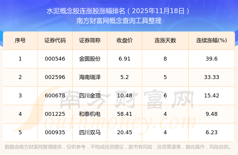 根據(jù)南方財(cái)富網(wǎng)概念查詢工具數(shù)據(jù)統(tǒng)計(jì),截止2025年11月18日收盤,水泥概念股共有5只個股實(shí)現(xiàn)連漲。其中連續(xù)漲幅較大的個股有金圓股份、海南瑞澤、四川金頂?shù)龋B續(xù)漲幅分別為39.60%、33.33%、15.42%。