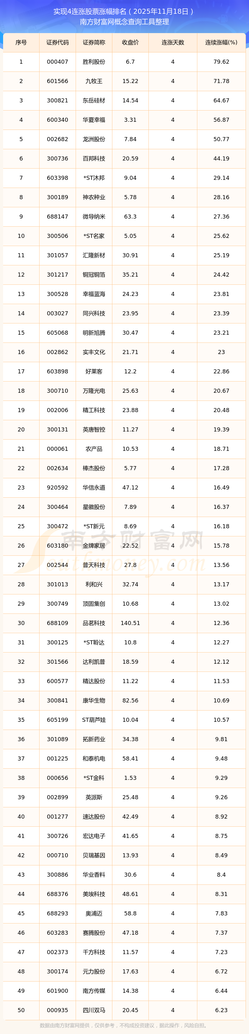 2025年11月18日實(shí)現(xiàn)4連漲股票漲幅排名