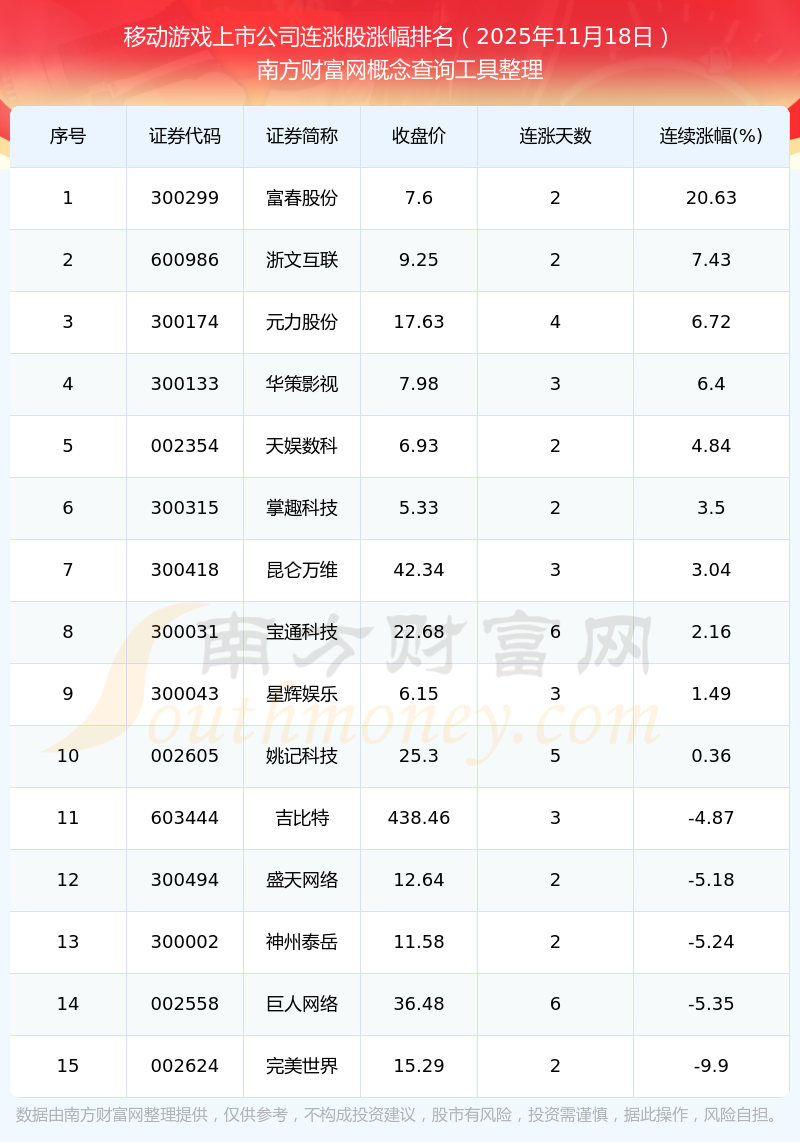2025年11月18日移動(dòng)游戲上市公司連漲股漲幅排名