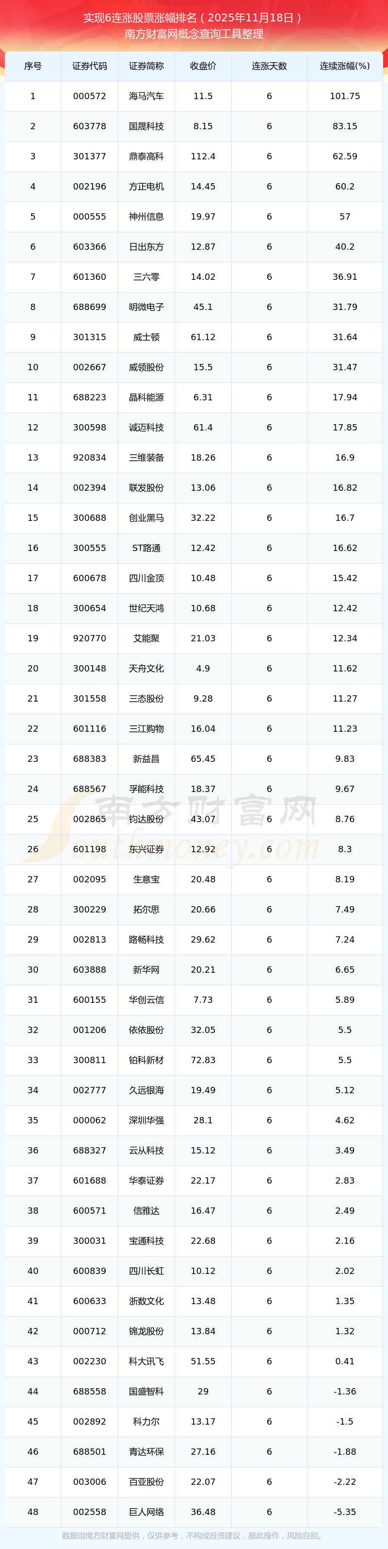 根據(jù)南方財(cái)富網(wǎng)概念查詢工具數(shù)據(jù)統(tǒng)計(jì),截止2025年11月18日收盤,共有48只個股實(shí)現(xiàn)6天連漲。其中連續(xù)漲幅較大的個股有海馬汽車、國晟科技、鼎泰高科等,連續(xù)漲幅分別為101.75%、83.15%、62.59%。
