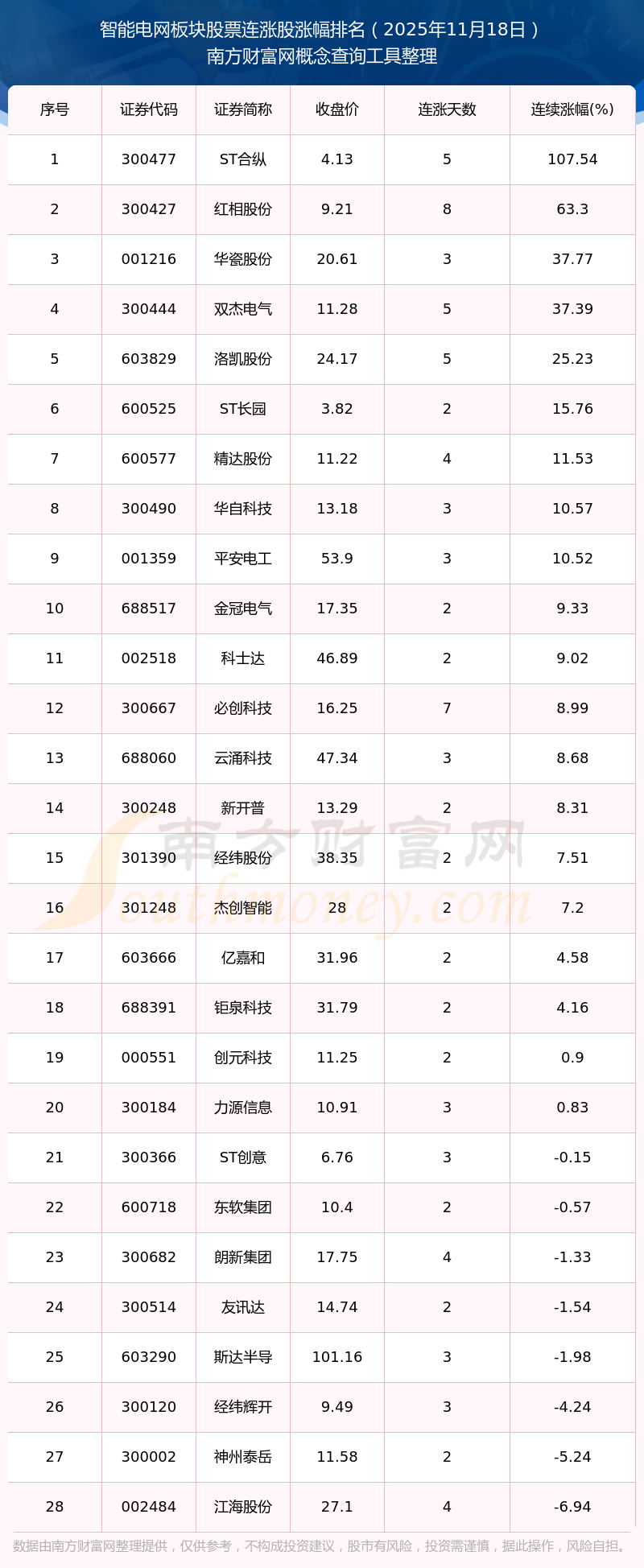 2025年11月18日智能電網(wǎng)板塊股票連漲股漲幅排名
