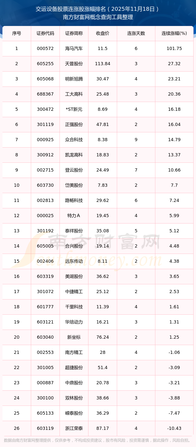 根據(jù)南方財富網(wǎng)概念查詢工具數(shù)據(jù)統(tǒng)計,截止2025年11月18日收盤,交運設備股票共有26只個股實現(xiàn)連漲。其中連續(xù)漲幅較大的個股有海馬汽車、天普股份、明新旭騰等,連續(xù)漲幅分別為101.75%、27.32%、23.21%。