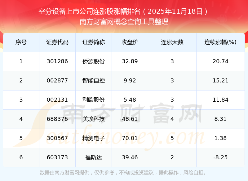 2025年11月18日空分設(shè)備上市公司連漲股漲幅排名