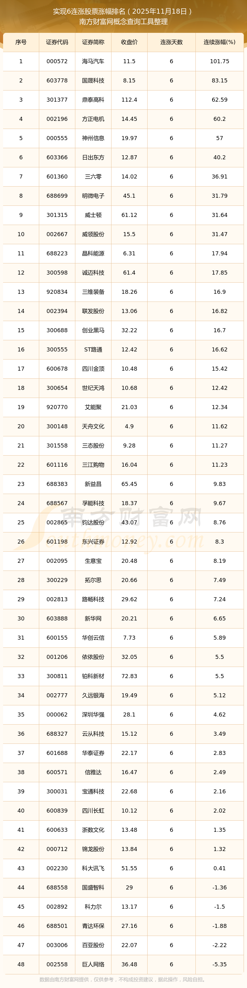 根據(jù)南方財(cái)富網(wǎng)概念查詢工具數(shù)據(jù)統(tǒng)計(jì),截止2025年11月18日收盤,共有48只個(gè)股實(shí)現(xiàn)6天連漲。其中連續(xù)漲幅較大的個(gè)股有海馬汽車、國(guó)晟科技、鼎泰高科等,連續(xù)漲幅分別為101.75%、83.15%、62.59%。