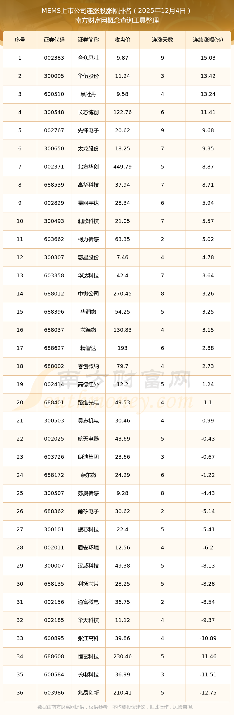 2025年12月4日MEMS上市公司連漲股漲幅排名