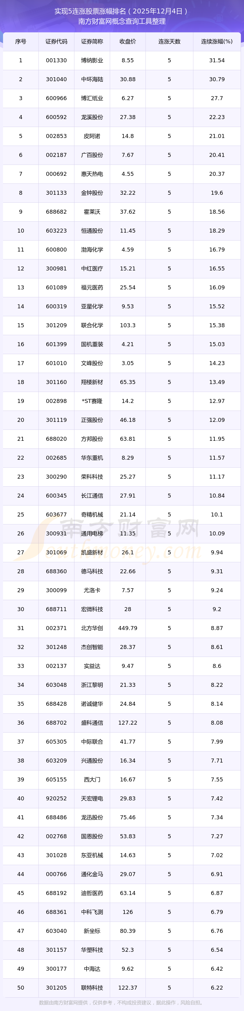 2025年12月4日實現(xiàn)5連漲股票漲幅排名